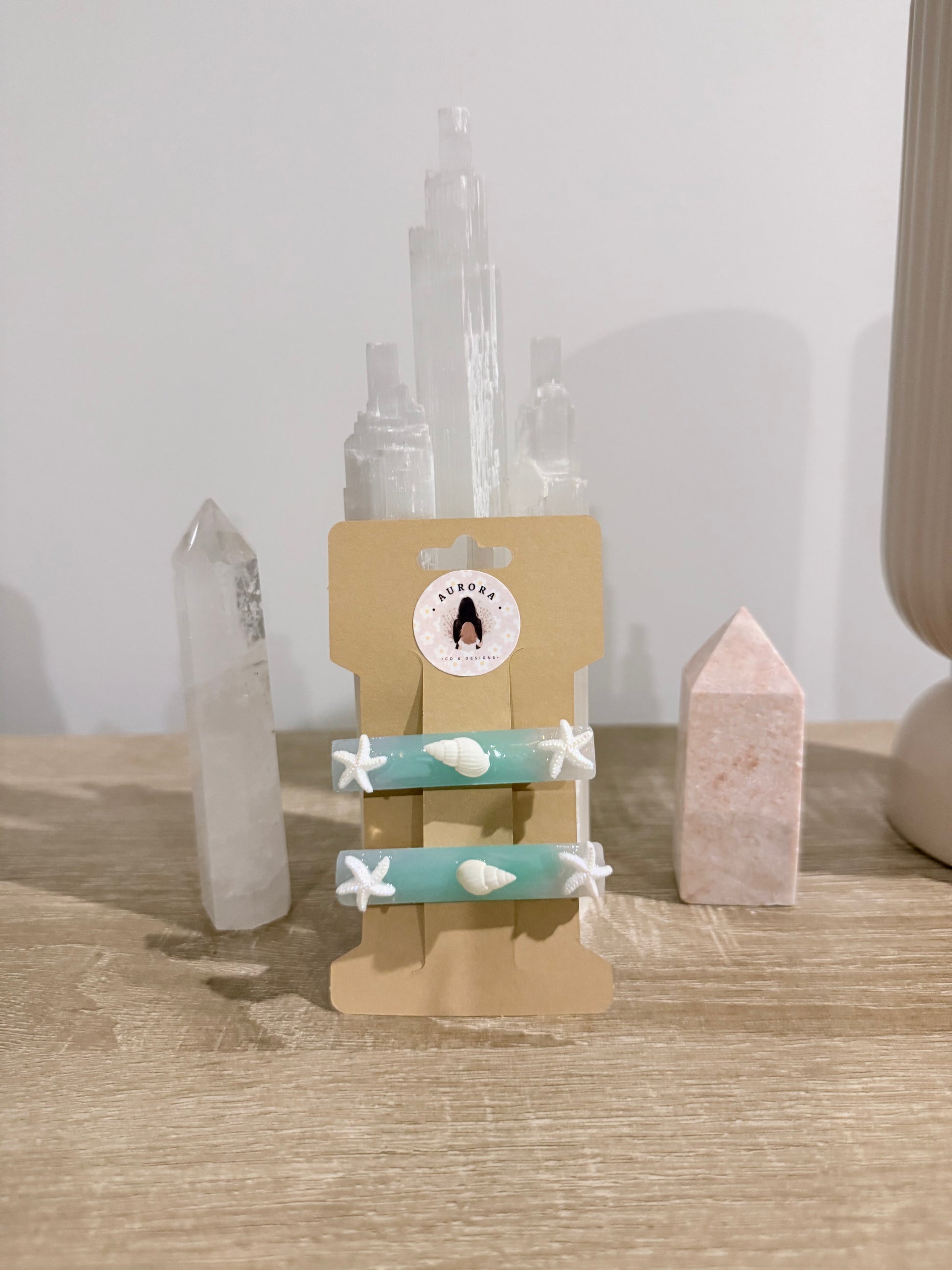Bring a touch of the seaside to your style with these stunning ocean-inspired hair clips. Each clip features a soft aqua base, beautifully accented with delicate white seashells and starfish for the perfect beachy vibe.