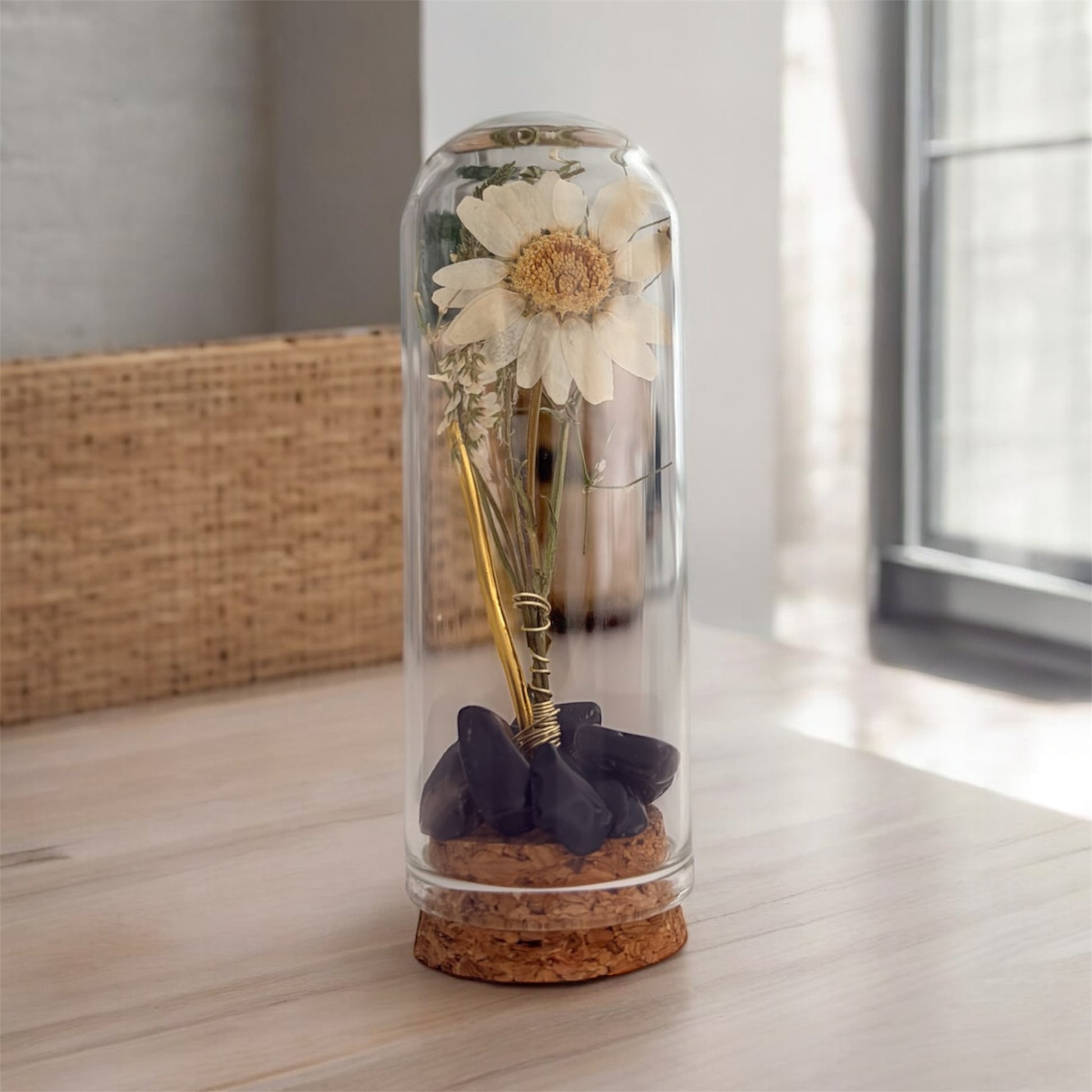 This elegant crystal display features a delicate preserved flower encased in a clear glass dome, grounded by powerful Black Obsidian crystals at the base. Both beautiful and intentional, this piece blends soft botanical energy with strong protective grounding.