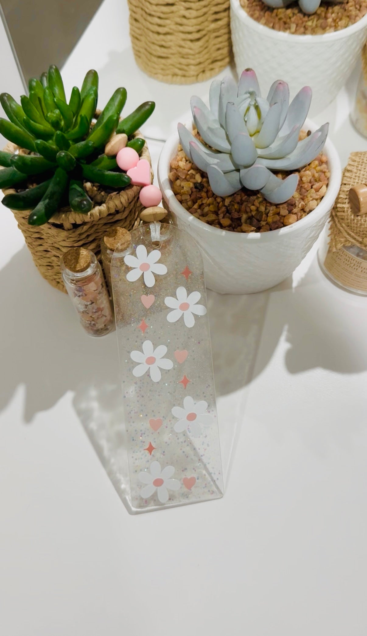 Brighten up your reading with this adorable daisy-themed bookmark. Made with a clear resin base filled with subtle glitter, it features sweet white daisies, soft pink hearts, and star accents for a dreamy touch. The lightweight design is durable and easy to slip between pages, making it a perfect little gift for book lovers, students, or anyone who enjoys adding a bit of sparkle to their reading routine.