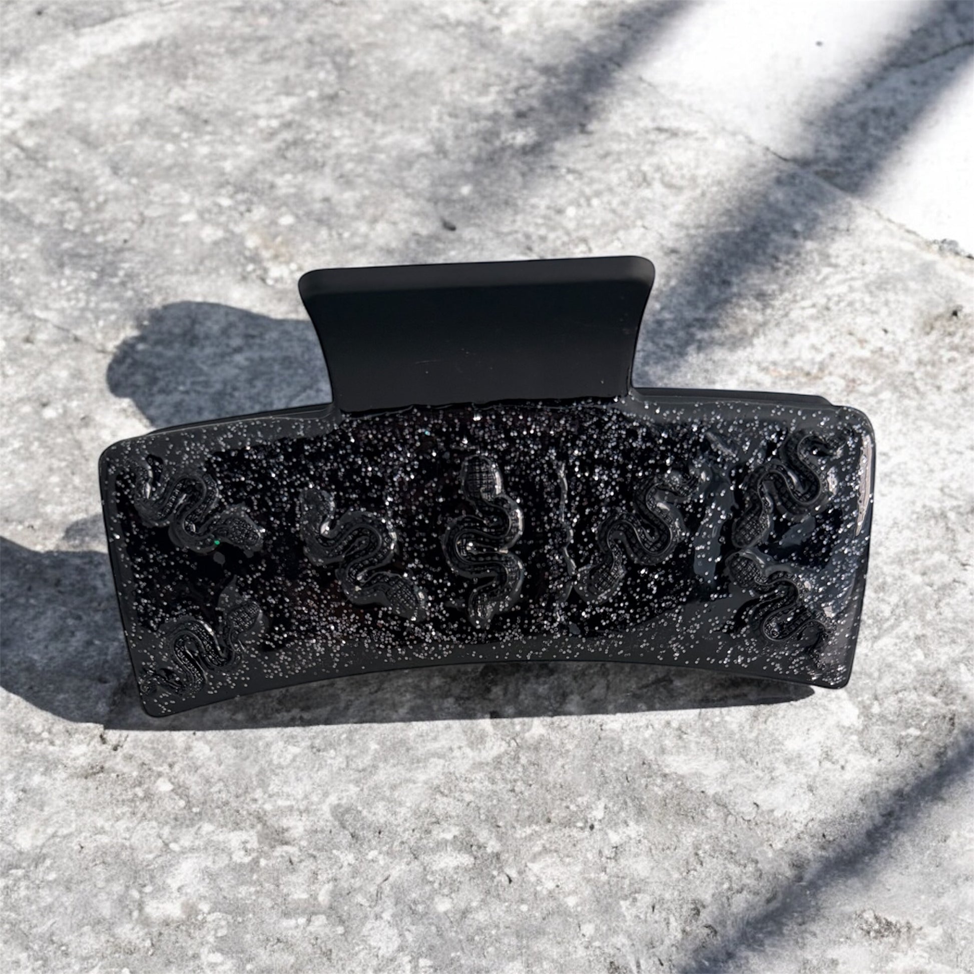 Turn everyday hair into a statement. This sleek black claw clip is infused with subtle shimmer and embossed serpent detailing — a symbol of transformation, protection and feminine power. The glossy, speckled finish catches the light beautifully while keeping things dark, elegant and a little bit dangerous.
