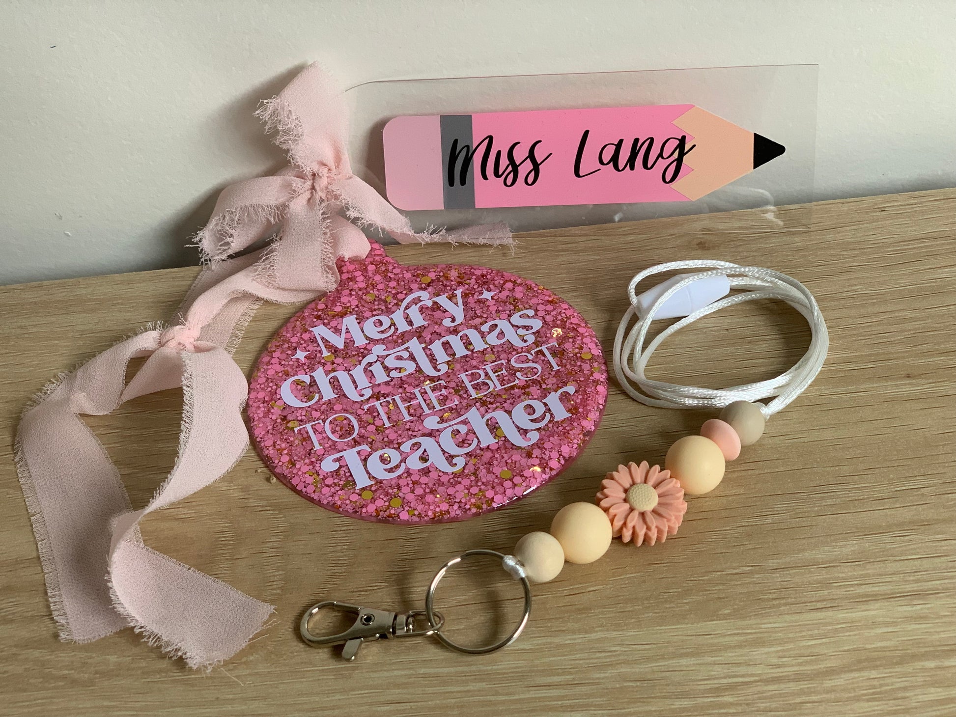 Let your favourite teacher or coworker know how much you appreciate them with a personalised lanyard, Bookmark & Christmas bauble.