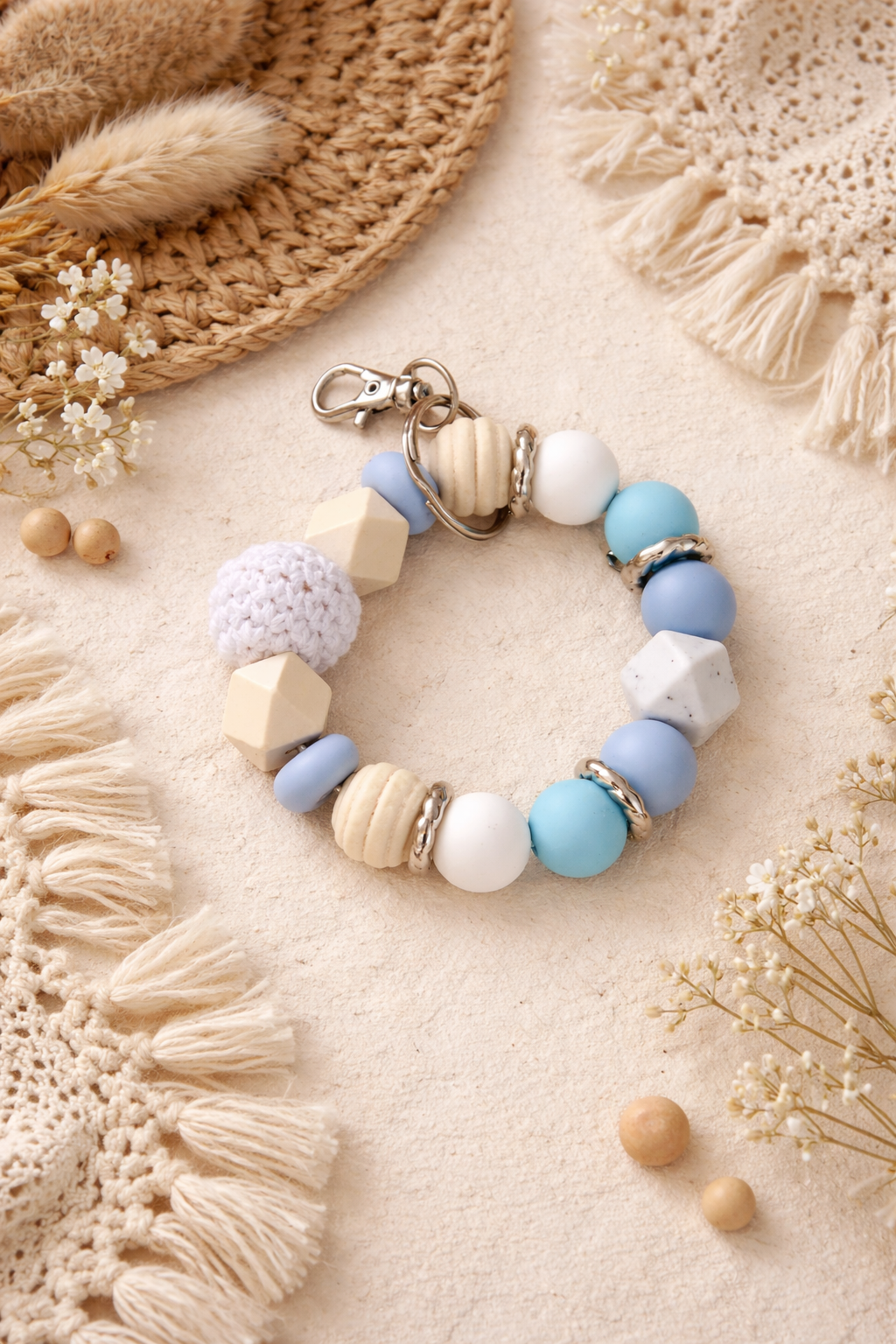 Keep your keys stylishly within reach with our handmade silicone beaded wristlet keychains. Each wristlet is designed with a mix of high-quality silicone, wooden, and crochet accent beads for a soft, comfortable fit around your wrist.